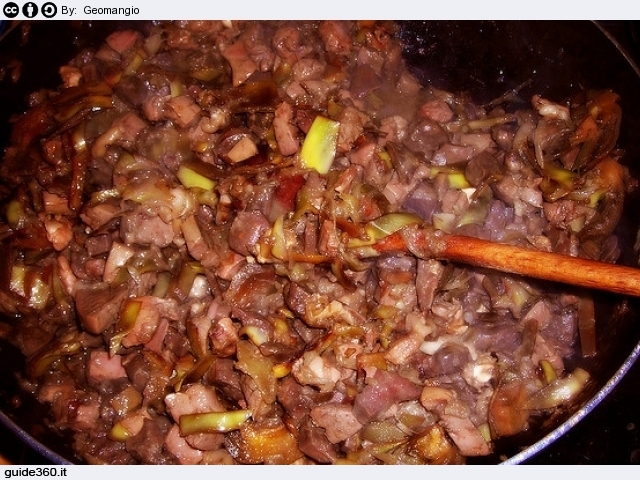 Preparare i carciofi, togliendogli le parti filamentose e dure interne e due-tre giri delle foglie esterne, tagliare a fette e precuocere in un padellino con dell’olio; parallelamente preparare un’altra padella con il soffritto di odori e il polmone e le altre interiora, a fuoco molto basso, e aggiungere poi, dopo circa 10-15 minuti, il cuore ed il resto della carne (lasciando ancora da parte il fegato) e i carciofi: man mano che aumentano gli ingredienti nel tegame alzare il livello del fuoco. Dopo altri 15-20 minuti aggiungere il fegato nella quantità desiderata (di solito la metà ): aggiungendo il vino bianco, lasciare in cottura per altri 15-20 minuti, e quando anche il fegato sarà rosolato, aggiungere i carciofi, condire con sale e pepe e servire.